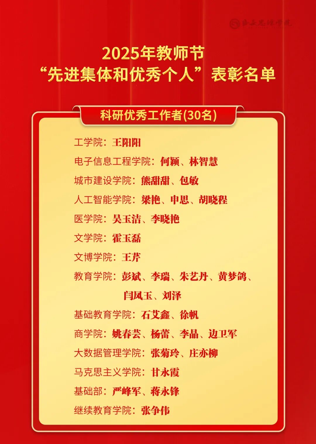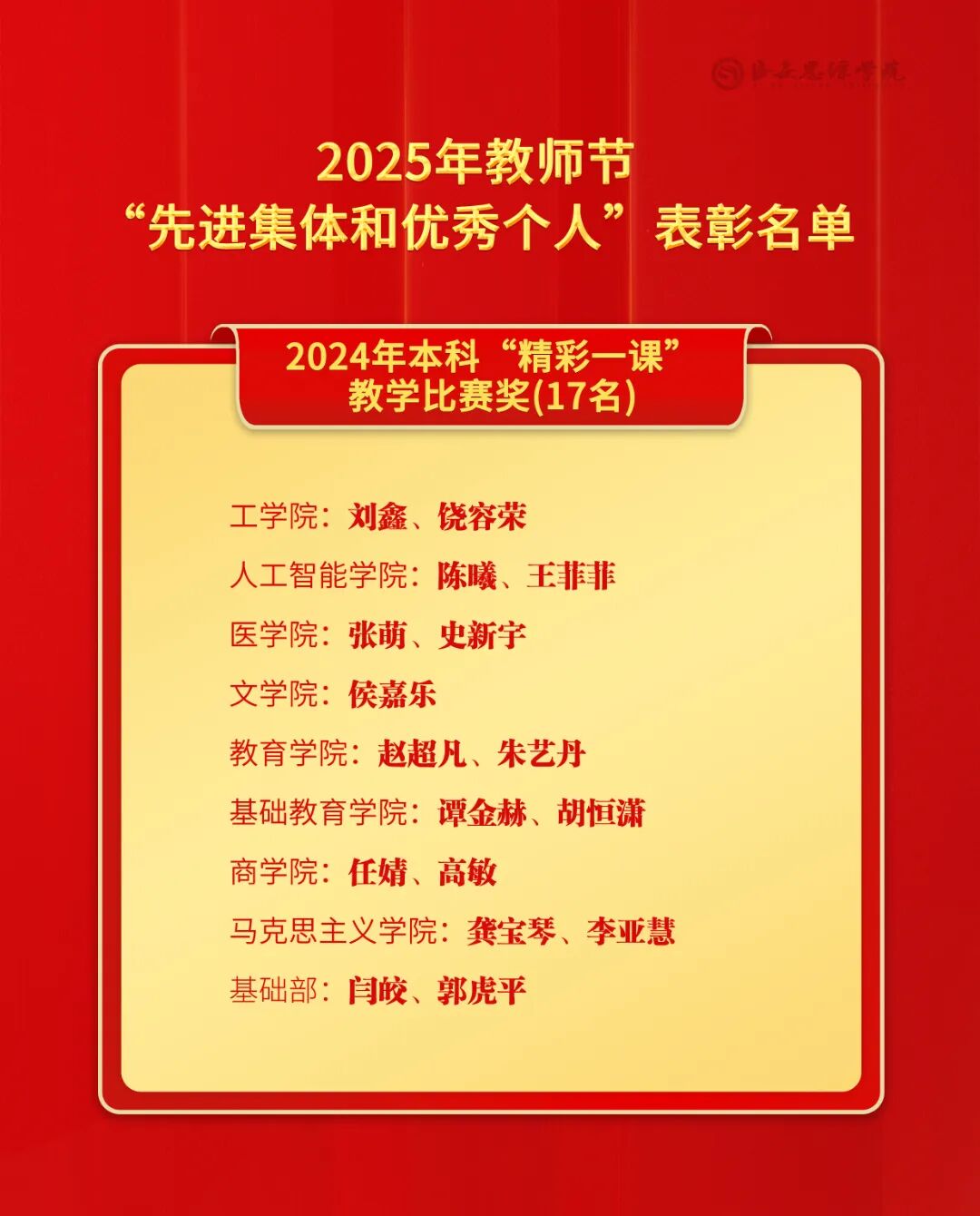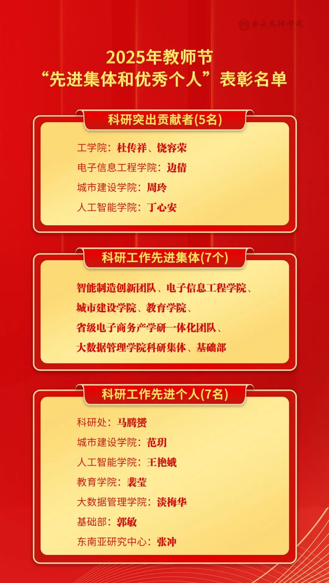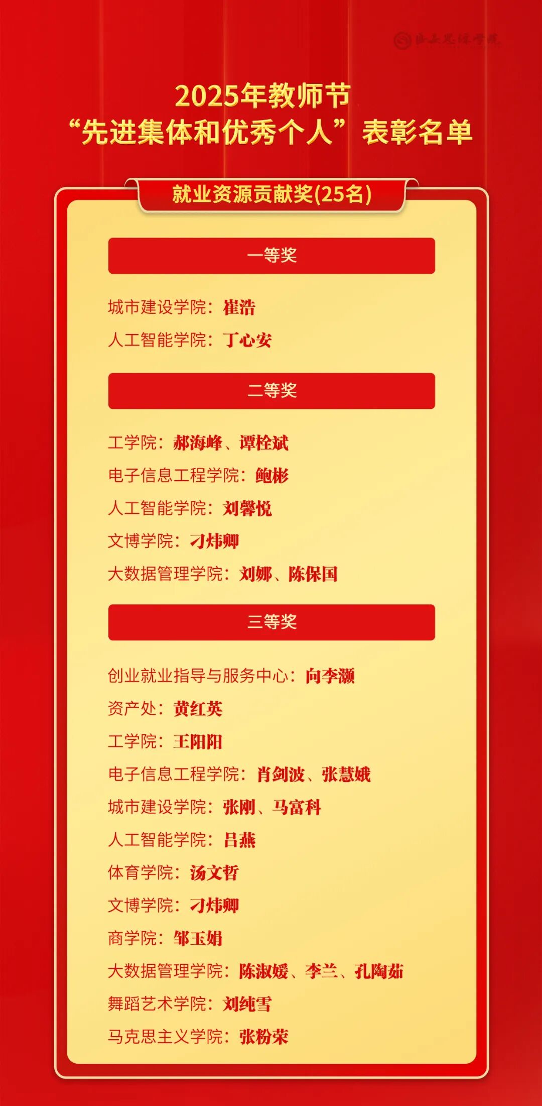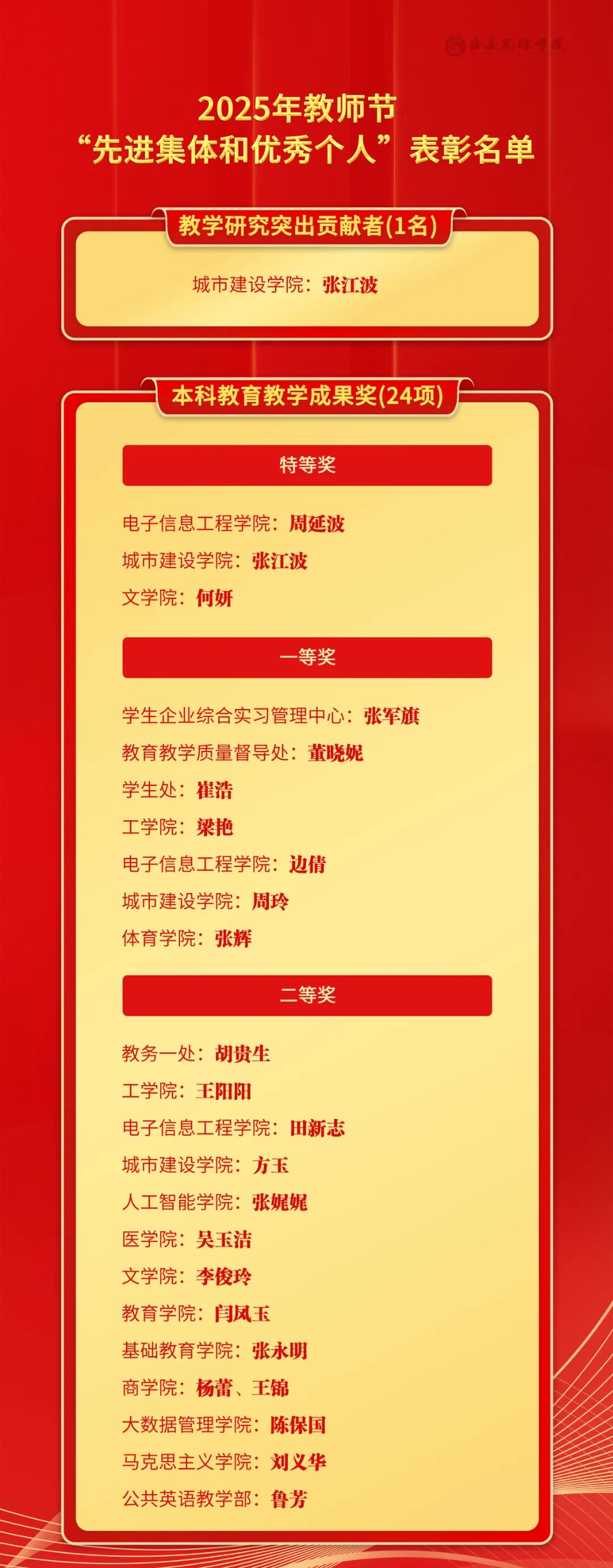 大会共表彰教学管理优秀教师12人,优秀教师25人,2024年本科“精彩一课”教学比赛奖17个,教学研究突出贡献者1人,本科教育教学成果奖24个,科研优秀工作者30人,科研突出贡献者5人,科研工作先进集体7个,科研工作先进个人7人,优秀辅导员13人,就业岗位推荐奖14个,就业资源贡献奖25个,升学工作集体贡献奖5个,就业工作先进集体5个,就业工作先进个人37人,优秀新生入学导师14人。与会校级领导干部为受表彰集体和个人颁奖。