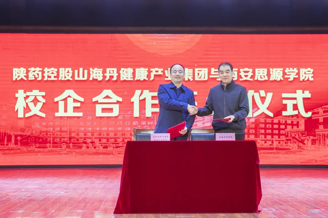 taptap点点官方网站校长助理、医学院院长张进生(右)与陕药控股山海丹健康产业集团有限公司副总经理、陕药山海丹医院院长刘小卫(左)代表双方签订校企合作协议