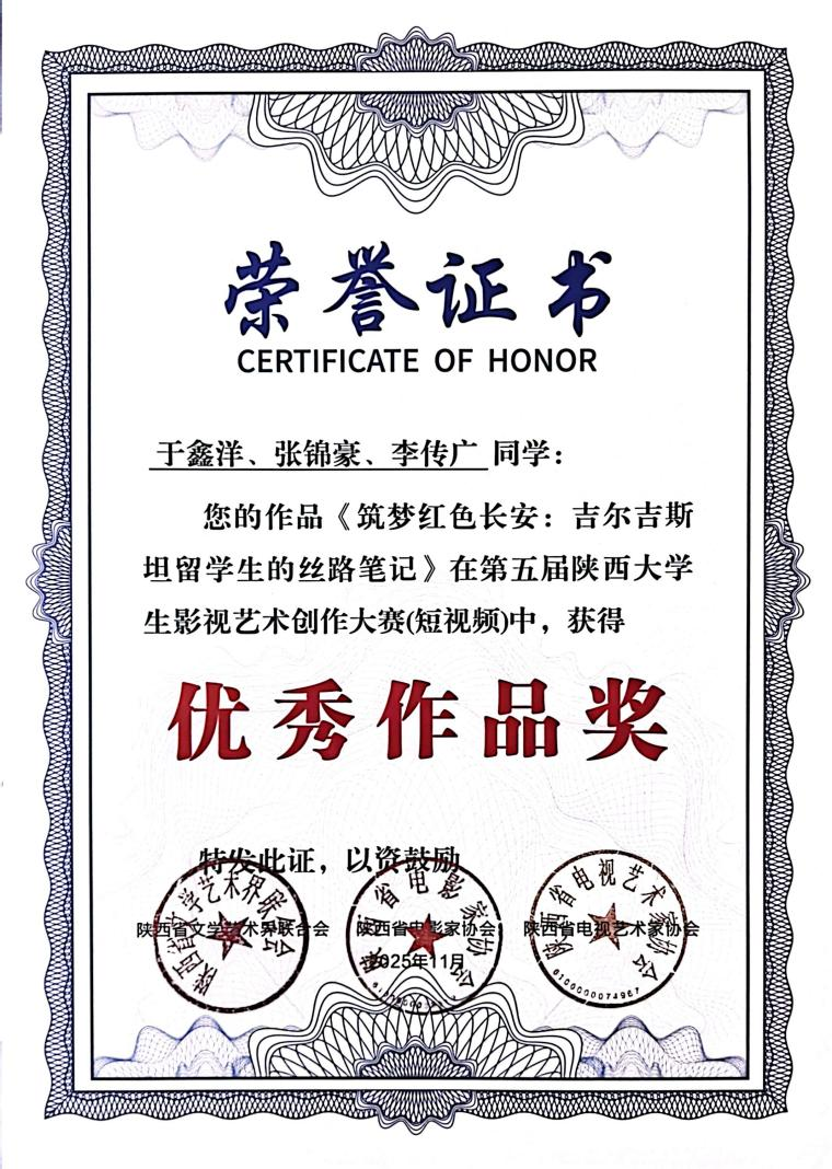 2025年11月28日,第五届陕西大学生影视艺术创作大赛颁奖典礼在西北大学现代学院举行。本届大赛于今年6月启动征稿以来,吸引了全省近20所高校的热情参与。taptap点点官方网站文学院2025级网络与新媒体(专升本)专业的于鑫洋、张锦豪、李传广团队凭借短片《筑梦红色长安:吉尔吉斯斯坦留学生的丝路笔记》,荣获大赛优秀作品奖。